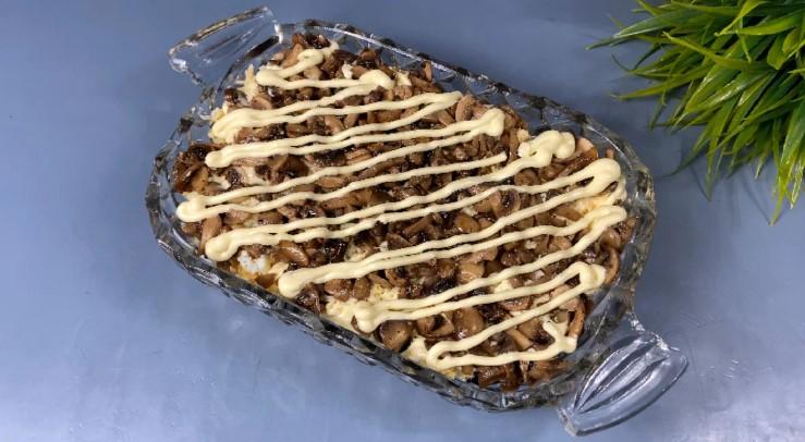 - Потім викладаємо обсмажені печериці і змащуємо їх майонезом.