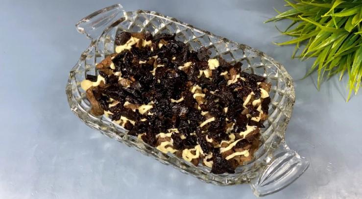 - Змащуємо печінку майонезом і викладаємо зверху дрібно нарізаний чорнослив.