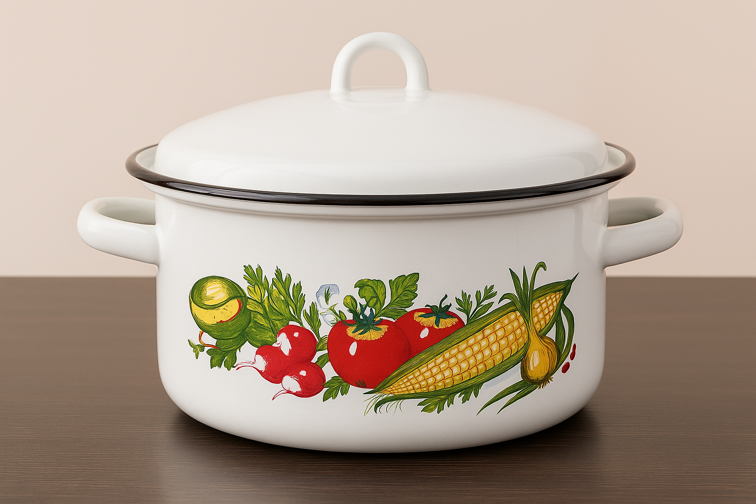 А от емальовані каструлі для мене — найкраще поєднання ціни й безпeки. Їхнє склоподібне покриття надійно захищає від впливу кислот і температур. Єдине правило — не бити й не ставити на сильний вогонь, щоб не пошкодити емаль.