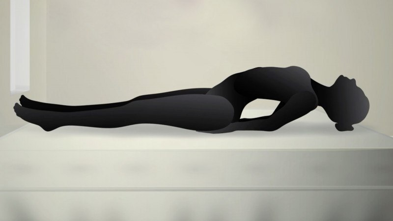 Станьте на коліна, нахиліться вперед і опустіть груди до підлоги. Руки витягніть назад у бік стоп. Перебуваючи в цій позі, дихайте глибоко й рівно, поки не відчуєте спокій і розслаблення. Розслабте плечі та м’язи обличчя, постарайтеся ні про що не думати.