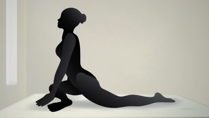 Станьте на коліна, спираючись руками вперед. Праве коліно обережно відведіть уперед і вбік так, щоб гомілка лежала між долонями перпендикулярно до тіла. Ліву ногу витягніть назад якомога рівніше. Будьте обережні — не перевантажуйте колінні зв’язки.
