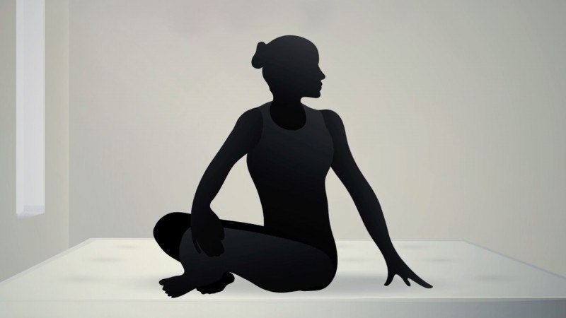 Сидячи рівно зі схрещеними ногами, покладіть праву руку на ліве коліно. Іншу руку поставте позаду на підлогу або матрац і обережно поверніть корпус ліворуч, не відриваючи таз. Дихайте глибоко й рівно. Повторіть у інший бік.